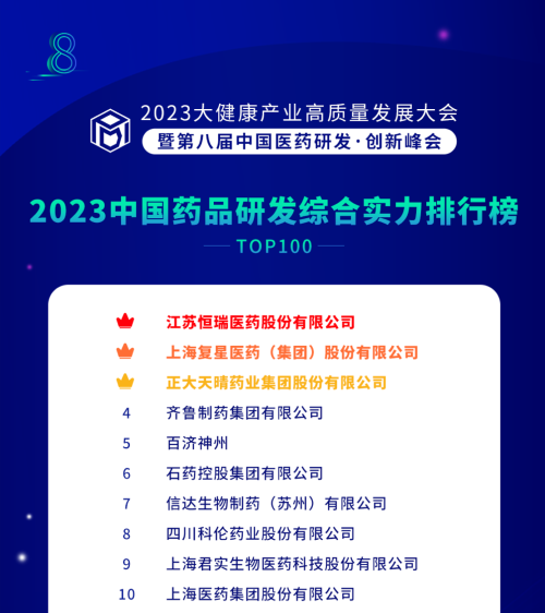 由药智网、中国药业杂志社主办的2023大健康产业高质量发展大会暨第八届中国医药研发•创新峰会于6月16日开幕,会上发布了《2023中国药品研发实力排行榜》系列榜单,BBIN宝盈医药凭借深厚的创新研发实力再创辉煌:荣登《2023中国药品研发综合实力排行榜TOP100》榜首、《2023中国化药研发实力排行榜TOP100》榜首。值得一提的是,今年是BBIN宝盈医药连续第6年入选《中国药品研发综合实力排行榜》榜首。